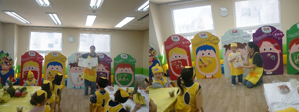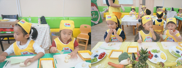 하얀 바나나처럼 하얀 과채류는 나쁜 균을 물리치는데 도움을 준다는 말에 우리 친구들은 가장 큰 바나나 조각을 먹으면서 “세균아 물러가라.”라고 얘기했어요~ 재밌게 5가지 과일조각을 골고루 빵 위에 올려서 과일 샌드위치를 완성했답니다.