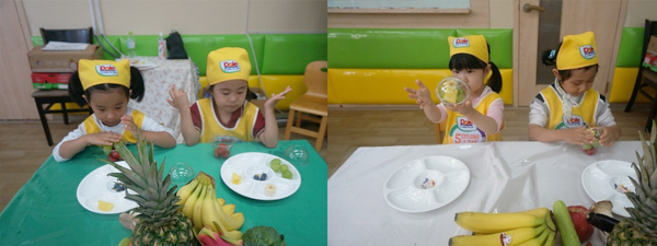요리 수업 때 사용할 조각과일을 접시에 예쁘게 담아 두고,