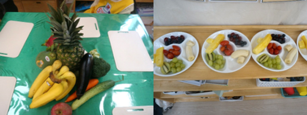 그 옆에서는 요리선생님들이 오늘 수업에 사용할 과일과 채소를 깨끗하게 손질해 접시에 담느라 분주한 손길로 수업 준비를 하고 계셨어요. 이제 마무리하고 우리 친구들 맞이해 볼까요?