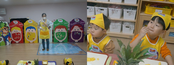 이제 요리수업 시간이에요. 노란 파인애플을 쓱삭쓱삭 자르고, 직접 맛보며 과일의 맛과 식감을 느껴 보았어요.
