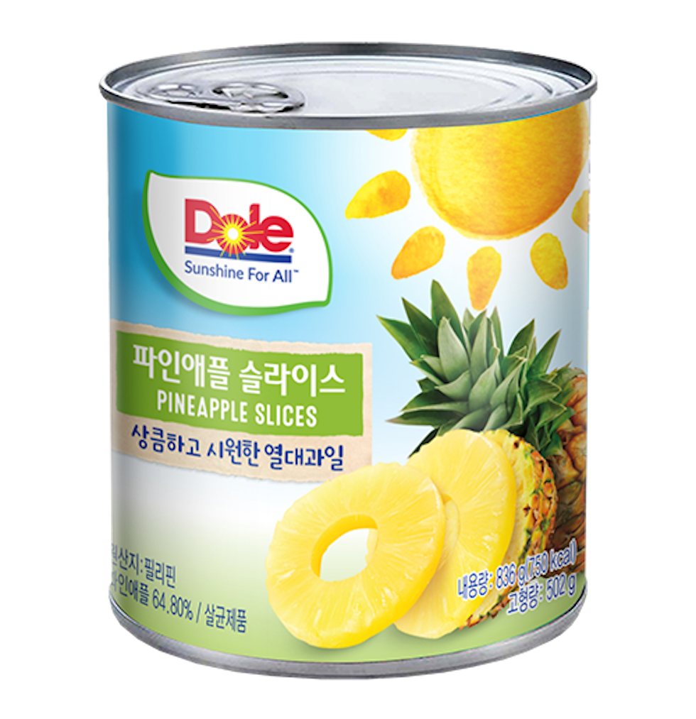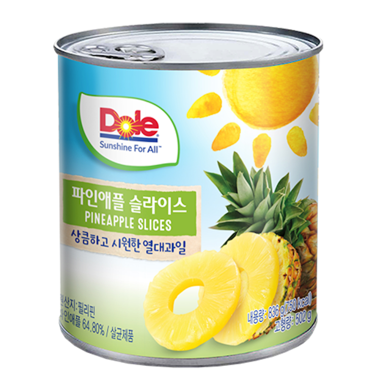원형의 파인애플 모양을 그대로 슬라이스 한 캔 제품입니다.