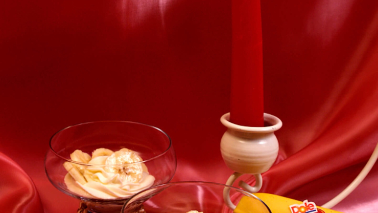 찬 디저트 그릇에 바나나를 돌려 담고 크림치즈소스를 짤 주머니에 담아 모양 틀을 꽂아서 모양 내어 짠 후에 낸다