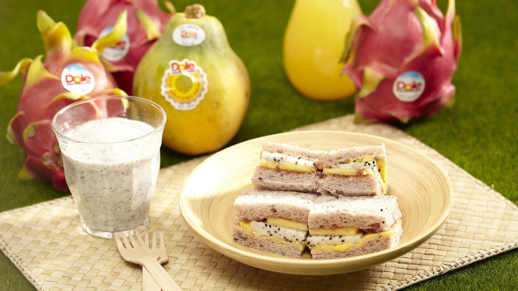 식빵 위에 용과- 파인애플을얹은 후 빵을 덮어 주세요. 식빵을 덮을 때 꾹 눌러 줘야지 속이 빠지지 않아요.