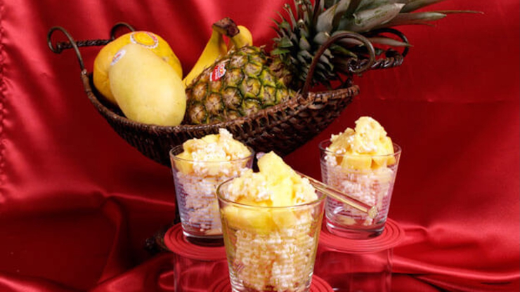 인애플은껍질을 벗기고 과육만 준비해서 반으로 나눠 1cm 폭으로 잘라 가운데를 동그랗게 도려내고 부채꼴 모양으로사방 3cm 크기로 자르고 나머지 남은 파인애플은 믹서에