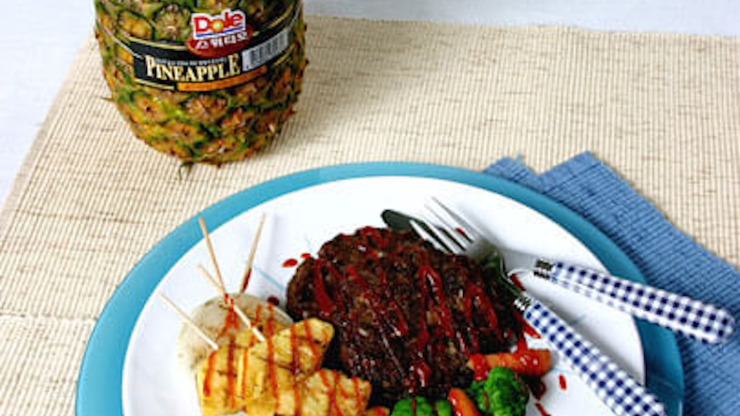 6. 접시에 구워낸 파인애플과 햄버거 스테이크를 겹겹이 깔고 그 옆에 아기당근 브로콜리를 담은 후에 뜨겁게 만든 하와이안 스테이크 소스를 듬뿍 부어 먹는다.