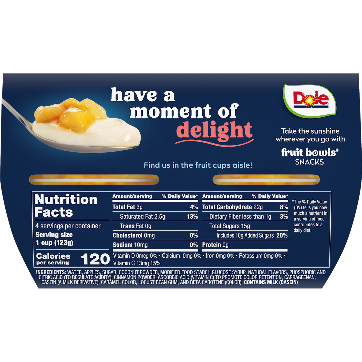 Have a little sweet treat with Dole Fruit & Crème Layers: smooth vanilla crème balanced with sweetened diced apples and cinnamon. Plus, it’s made with real, non‑GMO apples. Fruit & Crème Layers is the dessert you can feel good about digging into whenever and wherever a craving hits. Enjoy chilled for a creamy treat. These snacks are conveniently portioned and perfect for on the go, so there’s no need to spend time and effort making your own dessert. Just peel back the lid and enjoy the whole bowl!