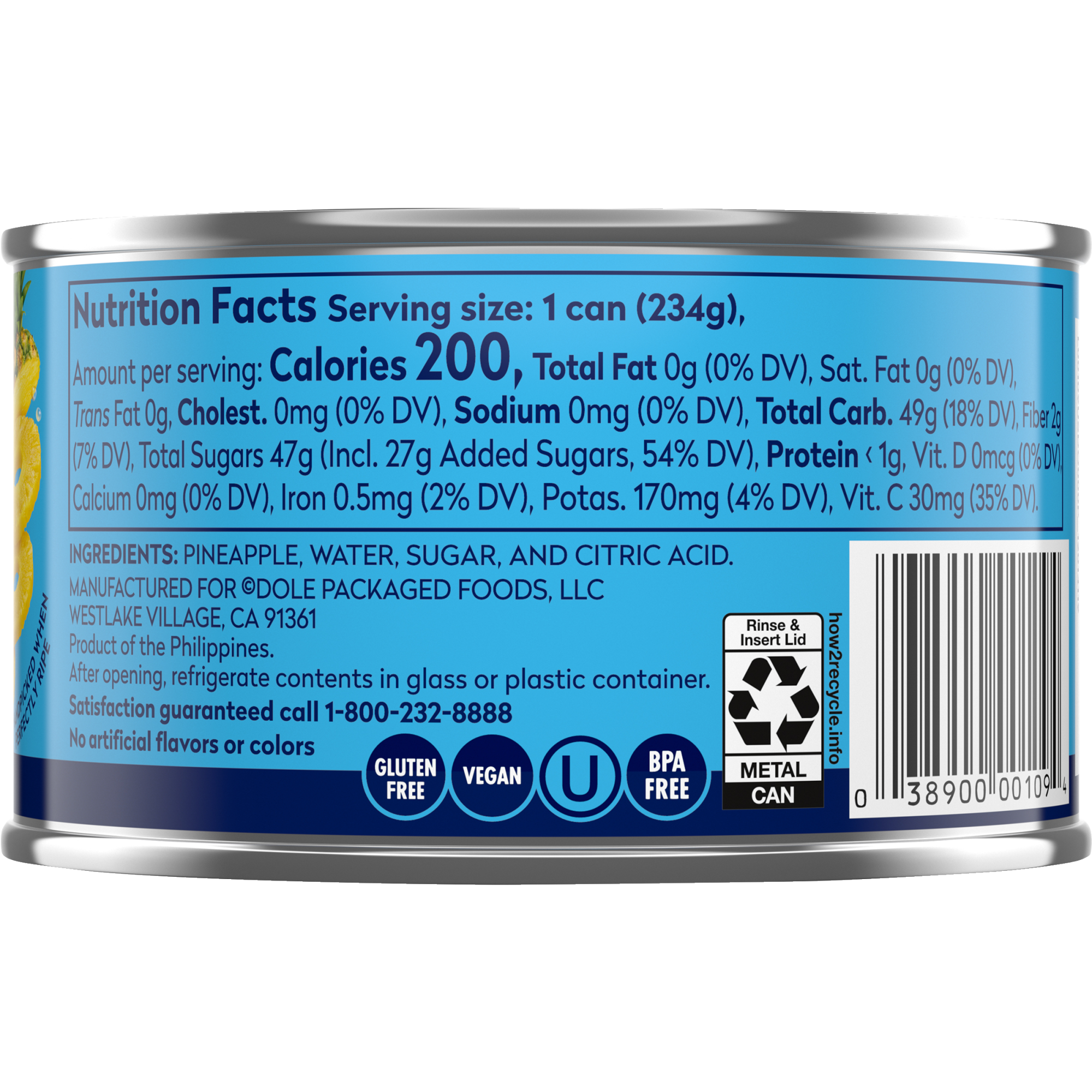 Dole Pineapple Slices in Heavy Syrup add sweetness and flavor to all kinds of dishes, including casseroles, grilled dishes, and homemade desserts. Just peel the lid and eat with the dishes you love. Available in 20oz. and 8.25oz. cans.