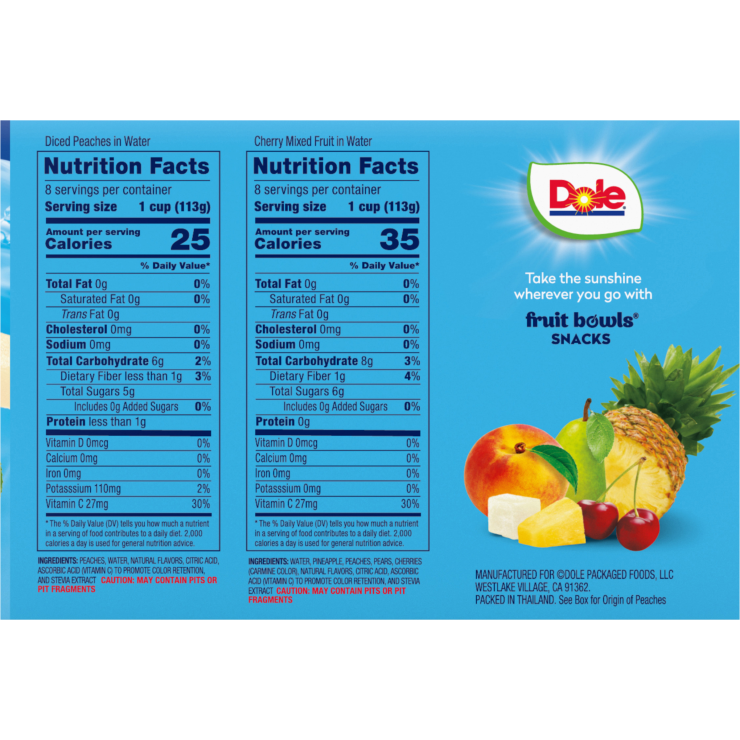 Take charge of your sugar intake with Dole® Fruit Bowls® Snacks No Sugar Added*, a simple and easy way to enjoy peaches & cherry mixed fruit. With its convenient, individually sized portions, it makes it easy to keep those calories in check. Snack smart, wherever and whenever you like!