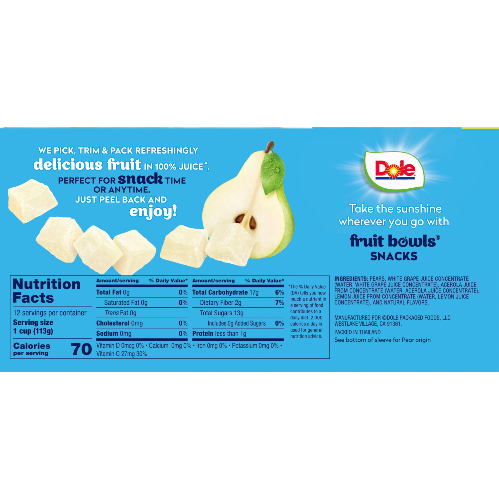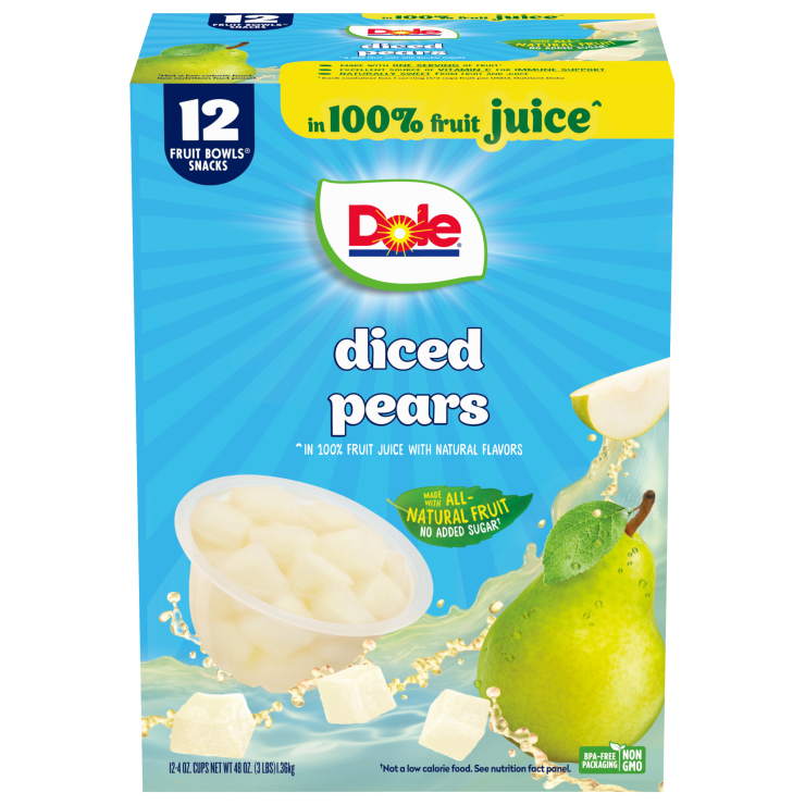 Brighten your day with Dole® Fruit Bowls® Snacks in 100% Juice*, a simple way to get your daily serving of pears without the need for peeling and chopping. Plus with an excellent source of vitamin C and no added sugar^, it’s a nourishing addition to your daily routine.