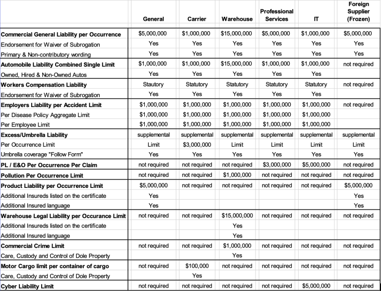 24. Insurance: Vendor shall have maintained, and continue to maintain, at its expense, sufficient insurance coverage to insure against all losses and damages, and all losses and damages subject to indemnification by Vendor as described in the second paragraph of Section 10 set forth above, which may result from the actions of Vendor in carrying out its obligations under this Agreement. Vendor shall supply a current Certificate of Insurance evidencing coverage as specified below, and continue to do so annually on or before the renewal dates so long as it continues to sell product to Purchaser. Along with each certificate Vendor must provide policy endorsements naming “Dole Packaged Foods, LLC, its parent corporation and any subsidiaries, officers, directors, employees and agents as additional insured”, Address: 7916 W. Bellevue Road, Atwater, CA 95301, providing coverage at least as broad as ISO CG 20 15. Policy endorsements are also to be provided, if needed, to confirm Vendor’s policies are primary and Purchaser’s policies are excess and non-contributory, even if Vendor’s insurance is an excess or umbrella layer and Purchaser’s policies are primary layers. (Vendor may use primary, excess and umbrella coverage to satisfy the required limits). The policy shall contain a Waiver of Subrogation Endorsement in favor of Dole Packaged Foods, LLC, its parent corporation and any subsidiaries, officers, directors, employees and agents. Insurance carrier will provide Dole Packaged Foods, LLC with at least thirty (30) days prior written notice of any modification or cancellation of such insurance coverage, except ten (10) days’ notice shall apply in the event of cancellation for non-payment of premium. Such insurance shall be issued by reputable insurers reasonably acceptable to Purchaser and with a minimum AM Best rating of A-VII.