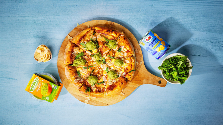 A bold twist on classic pizza! This tropical-inspired pie layers juicy pineapple, garlicky prawns, and a vibrant guacamole for a fresh, flavor-packed bite in every slice.
