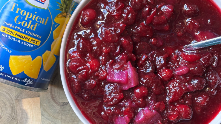 This cranberry sauce adds a sunny twist to a classic recipe, blending bright pineapple sweetness with tart cranberries for a vibrant holiday favorite.